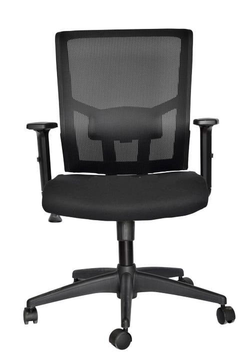 Silla gerencial ergonómica, cómoda, ideal para largas jornadas laborales, espaldar en malla negra traslucida de alta resistencia, apoyo lumbar graduable en profundidad, brazos graduables en altura, asiento en espuma de alta densidad, tapizado en tela micro suave, base nylon de alto impacto, rodachinas de suave rodamiento y rápido cambio de dirección.